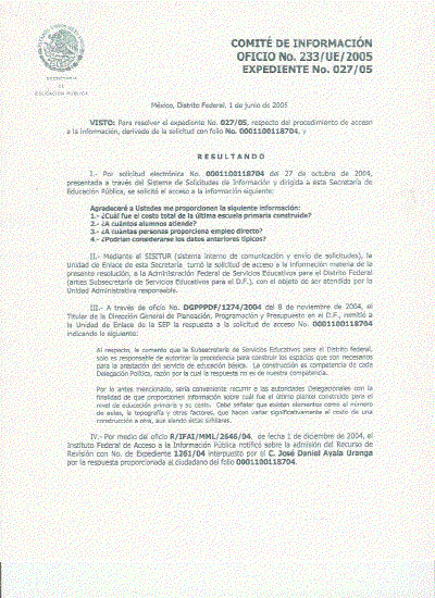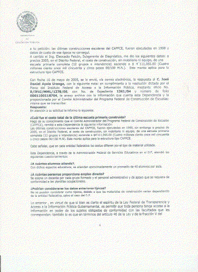 Con fecha 16 de mayo de 2005, se le envió, vía correo electrónico, la respuesta al C. José Daniel Ayala Uranga, con la siguiente nota: en cumplimiento a la resolución dictada por el Pleno del Instituto Federal de Acceso a la Información Pública, mediante oficio No. R/IFAI/MML/1278/0S, con No. de Expediente 1261/04 y número de folio 0001100118704, le anexo archivo con la información que cuenta esta Dependencia y la proporcionada por el Comité Administrador del Programa Federal de Construcción de Escuelas; misma que se transcribe: Respuesta: En atención a su solicitud le informo lo siguiente: ¿Cuál fue el costo total de la última escuela primaria construida? Hago de su conocimiento que el Comité Administrador del Programa Federal de Construcción de Escuelas (CAPFCE), remitió a esta Dependencia la siguiente información:. Las últimas construcciones escolares del CAPFCE, fueron ejecutadas en 1998, sin embargo a precios de 2005, en el Distrito Federal, el costo de construcción, sin mobiliario ni equipo, de una escuela primaria completa (12 grupos e intendencia) asciende a $4'111,055.00 (Cuatro millones ciento once mil cincuenta y cinco pesos 00/100 M.N). Este monto aplica para la estructura tipo CAPFCE.