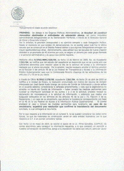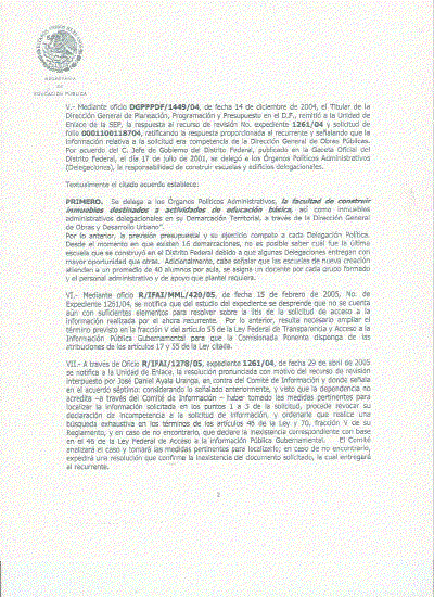 Mediante oficio DGPPPDF/I449/O4, de fecha 14 de diciembre de 2004, el Titular de la Dirección General de Planeación, Programación y Presupuesto en el D.F., remitió a la Unidad de Enlace de la SEP, la respuesta al recurso dé revisión No. expediente 1261/04 y solicitud de folio 0001100118704, ratificando la respuesta proporcionada al recurrente y señalando que la información relativa a la solicitud era competencia de la Dirección General de Obras Públicas. Por acuerdo del C. Jefe de Gobierno del Distrito Federal, publicado en la Gaceta Oficial del Distrito Federal, el día 17 de julio de 2001, se delegó a los Órganos Políticos Administrativos (Delegaciones), la responsabilidad de construir escuelas y edificios delegacionales.