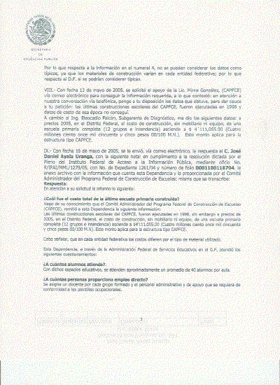 VIII.- Con fecha 13 de mayo de 2005¡ se solicitó el apoyo de la Uc. Mima González¡ (CAPFCE) vía correo electrónico para conseguir la información requerida¡ a lo que contestó: en atención a nuestra conversación vía telefónica, pongo a tu disposición los datos que obtuve, para dar cauce a tu petición: las últimas construcciones escolares del CAPFCE, fueron ejecutadas en 1998 y datos de costo de esa época no conseguí. A cambio el Ing. 8eocadio Falcón, Subgerente de Diagnóstico, me dio los siguientes datos: a precios 2005, en el Distrito Federal, el costo de construcción¡ sin mobiliario ni equipo, de una escuela primaria completa (12 grupos e intendencia) asciende a $ 4' 111,055.00 (Cuatro millones ciento once mil cincuenta y cinco pesos 00/100 M.N.).Este monto aplica para la estructura tipo CAPFCE. . IX.- Con fecha 16 de mayo de 2005, se le envió, vía correo electrónico¡ la respuesta al C. José Daniel Ayala Uranga, con la siguiente nota: en cumplimiento a la resolución dictada por el Pleno del Instituto Federal de Acceso a la Información Pública, mediante oficio No. R/IFAI/MML/1278/05, con No. de Expediente 1261/04 y número de folio 0001100118704, le anexo archivo con la información que cuenta esta Dependencia y la proporcionada por el Comité Administrador del Programa Federal de Construcción de Escuelas; misma que se transcribe: Respuesta: En atención a su solicitud le informo lo siguiente: