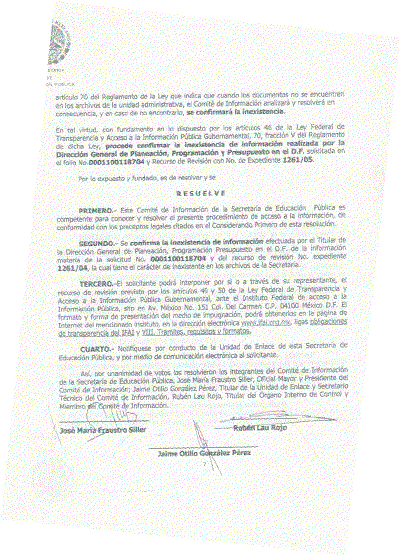 Así, por unanimidad de votos los resolvieron los integrantes del Comité de Información de la Secretaría de Educación Pública, José María Fraustro Siller, Oficial Mayor y Presidente del Comité de Información; Jaime Otilio González Pérez, Titular de la Unidad de Enlace y Secretario Técnico del Comité de Información, Rubén Lau Rojo, Titular del Órgano Interno de Control y Miembro Comité de Información.