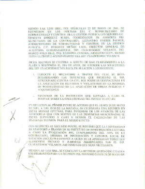 SIENDO LAS 12:00 HRS., DEL MIERCOLES 23 DE MAYO DE 2001, SE REUNIERON EN LAS OFICINAS DEL C. SUBSECRETARIO DE NORMATIVIDAD Y CONTROL DE LA GESTIÓN PÚBLICA LOS SEÑORES LIC. ERNESTO ENRIQUEZ RUBIO, COORDINADOR DE ASESORES DEL SECRETARIO DE LA CONTRALORÍA, ALEJANDRO TORRES PALMER, SUBSECRETARIO DE NORMATIVIDAD Y CONTROL DE GESTIÓN PÚBLICA, C.P. ROBERTO MUÑOZ LEOS, DIRECTOR GENERAL DE AUDITORÍA GUBERNAMENTAL, DIP. CUAUHTÉMOC VELASCO, ING. MARCO POLO DÍAZ, ING. LEANDRO ZAMORA, ARMANDO LEVY, SIENDO ESTOS ÚLTIMOS 3 ACOMPAÑANTES DEL DIP. CUAUHTÉMOC VELASCO.