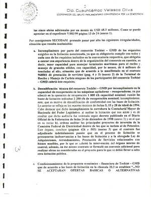 a. Incumplimiento por parte del consorcio Techint - GMD de los requisitos exigidos en la licitación mencionada, ya que es obligatorio cumplir con todos y cada uno de los requisitos incluidos en la convocatoria respectiva, que obligaba a contar con experiencia dentro de la organización del consorcio en cuestión, es decir, tener capacidad para manejar terminales marítimas para el recibo y. manejo de graneles sólidos, con capacidad, por lo menos, de 6 millones de toneladas al año, situación que de acuerdo a lo manifestado en el contrato 968001 de prestación de servicios (pag. 4 y 5) (anexo 2) de la Terminal de Recibo y Manejo de Carbón ninguno de los participates del consorcio Techint GMD cubrió éste requisito.
