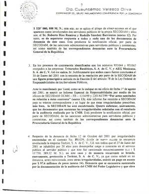 $320' 000, 000 M. N. más aún, no se aplica el pliego de observaciones en el que aparecen como involucrados dos servidores públicos de la propia SECODAM y ellos son: el Sr. Roberto Rios Ramírez y Rodolfo Sánchez Barrientos (anexo 12). Por tanto, es de esperarse respuesta a todos y cada uno de los documentos de denuncia de este caso. Está pendiente la notificación oficial. por parte de SECODAM, de las sanciones administrativas para servidores públicos y contratistas. así como también de las correspondientes denuncias ante la Procuraduría General de la República