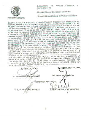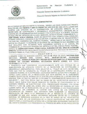 EN LA CIUDAD DE MÉXICO DISTRITO FEDERAL, SIENDO LAS ONCE HORAS CON TREINTA MINUTOS DEL DÍA TREINTA Y UNO DE ENERO DEL DOS MIL UNO, EN EL LUGAR QUE OCUPAN LAS OFICINAS DE LA SUBDIRECCIÓN DE ATENCIÓN DIRECTA DE LA SECRETARÍA DE LA CONTRALORÍA Y DESARROLLO ADMINISTRATIVO, UBICADAS EN LA AVENIDA INSURGENTES SUR NÚMERO 1735, PLANTA BAJA, ALA NORTE, COLONIA GUADALUPE INN, DELEGACIÓN ALVARO OBREGÓN, DE ESTA CIUDAD, COMPARECE EL C. JOSE DANIEL AYALA URANGA, QUIEN SE IDENTIFICA CON LICENCIA PARA CONDUCIR, NÚMERO C05203513, EXPEDIDA A SU FAVOR POR LA SECRETARÍA DE TRANSPORTES Y VIALIDAD DEL GOBIERNO DEL DISTRITO FEDERAL, MISMA QUE LE ES DEVUELTA POR SER DE SU UTILIDAD, Y A QUIÉN SE LE ADVIERTE DE LAS PENAS EN QUE INCURREN LOS QUE DECLARAN CON FALSEDAD ANTE AUTORIDAD DISTINTA DE LA JUDICIAL EN TÉRMINOS DE LA FRACCIÓN PRIMERA DEL ARTÍCULO 247 DEL CÓDIGO PENAL FEDERAL, ANTE EL C. LICENCIADO DANIEL PÉREZ RUEDA, SUBDIRECTOR DEL ÁREA DE ATENCIÓN DIRECTA, QUIÉN ACTÚA LEGALMENTE ACOMPAÑADO DE DOS TESTIGOS DE ASISTENCIA, QUIENES FIRMAN AL FINAL PARA CONSTANCIA-------------------------- -------------------------------------MANIFIESTA------------------------------------------------------------------------- LLAMARSE COMO HA QUEDADO ESCRITO, SER DE 52 AÑOS DE EDAD, NACIONALIDAD MEXICANA, ESTADO CIVIL CASADO, R.F.C. AAUD-481130-TW7, OCUPACIÓN COMERCIANTE, DOMICILIO PARA OIR Y RECIBIR NOTIFICACIONES CALLE WASHINGTON NÚMERO 157, COLONIA MODERNA, DELEGACIÓN BENITO JUÁREZ, C.P. 03510, TELÉFONO 557-79-74-82,------------------------------------------- Y MANIFIESTA QUE COMPARECE VOLUNTARIAMENTE ANTE LAS OFICINAS DE LA SUBDIRECCIÓN DE ATENCIÓN DIRECTA DE LA SECRETARÍA DE CONTRALORÍA Y DESARROLLO ADMINISTRATIVO, PARA SOLICITAR AL TITULAR DE ESTA SECRETARÍA, PARA QUE POR SU CONDUCTO, EL TITULAR DE LA CONTRALORÍA INTERNA EN LA COMISIÓN FEDERAL DE ELECTRICIDAD, LICENCIADA MARTHA LETICIA PINTO PALMER, LE EXPIDA COPIA SIMPLE DE LA RESOLUCIÓN QUE HAYA EMITIDO EN EL EXPEDIENTE NÚMERO QD/CFE/020-96, INICIADO EN LA CONTRALORÍA INTERNA DE LA SECRETARÍA DE ENERGÍA; POR LO QUE EN USO DE LA PALABRA EL COMPARECIENTE MANIFIESTA LO SIGUIENTE:"..QUE CON FECHA 10 DE ENERO DE MIL NOVECIENTOS NOVENTA Y CINCO, INICIE QUEJA POR MALOS MANEJOS EN CONTRA DE FUNCIONARIOS DE LA COMISIÓN FEDERAL DE ELECTRICIDAD (CFE), PRESENTANDO PRUEBAS; CON FECHA TREINTA Y UNO DE JUNIO DEL MISMO AÑO, LA SECRETARÍA DE ENERGÍA ME HIZO LLEGAR COPIA DE LA RESOLUCIÓN EN LA QUE EXONERABA A LOS FUNCIONARIOS DENUNCIADOS, SIN EMBARGO, AL CONTAR CON COPIAS DE LOS DIFERENTES DOCUMENTOS DE TRABAJO QUE SIRVIERON PARA ELABORAR LA MENCIONADA RESOLUCIÓN, ME DIRIGÍ A LA PRESIDENCIA DE LA REPÚBLICA, EL CATORCE DE DICIEMBRE DE ESE AÑO, SIENDO INFORMADO MEDIANTE OFICIO DE LA COMISIÓN NACIONAL DE DERECHOS HUMANOS EN EL MES DE MARZO DE MIL NOVECIENTOS NOVENTA Y SEIS, DE LA EXISTENCIA DE LA QUEJA QD/CFE/020-96, QUE HABÍA SIDO ABIERTA POR LA CONTRALORÍA INTERNA DE LA SECRETARÍA DE ENERGÍA, CON MOTIVO DEL ESCRITO DIRIGIDO A LA PRESIDENCIA; EL PRIMERO DE ABRIL DE MIL NOVECIENTOS NOVENTA Y SEIS, Y A SOLICITUD DE LA CONTRALORÍA INTERNA DE LA SECRETARÍA DE ENERGÍA PRESENTÉ ESCRITO EN EL QUE EN FORMA CLARA DEMOSTRABA QUE LAS PRUEBAS APORTADAS NO FUERON CONSIDERADAS EN NINGÚN MOMENTO POR EL ENTONCES CONTRALOR DE LA CFE, CONTADOR PÚBLICO JUAN AHUATZIN PONCE; CON FECHA VEINTIUNO DE JUNIO DE ESE MISMO AÑO, RATIFIQUÉ ESTA QUEJA ANTE LA SECRETARÍA DE ENERGÍA, SIN EMBARGO, EN FORMA INDEBIDA ESTE EXPEDIENTE FUE TURNADO AL CONTADOR PÚBLICO JUAN AHUATZIN PONCE, POR LA SECRETARÍA DE ENERGÍA, CONVIERTIENDOLO EN JUEZ Y PARTE; A LA FECHA NO TENGO CONOCIMIENTO DE RESOLUCIÓN ALGUNA EN LA QUE HAYAN SIDO DESVIRTUADAS LAS PRUEBAS APORTADAS POR MI, POR LO QUE SOLICITO, A ESTA AUTORIDAD COPIA SIMPLE DE LA RESOLUCIÓN QUE HAYA RECAÍDO SOBRE EL EXPEDIENTE, A EFECTO DE ESTAR EN POSIBILIDADES DE APORTARLO ANTE LOS DIVERSOS ACUERDOS DE INICIO QUE RECIENTEMENTE HAN SIDO ATRAÍDOS POR ESTA SECRETARÍA, EN LOS QUE SE DENUNCIA A LOS MISMOS FUNCIONARIOS, LA MISMA FORMA DE COMETER SUS ILÍCITOS Y HASTA LAS MISMAS COMPAÑÍAS CON QUE SE ASOCIAN PARA COMETERLOS, DEBO ACLARAR QUE ESTA SOLICITUD YA LA HICE A LA ENTONCES ENCARGADA DE LA CONTRALORÍA INTERNA EN CFE, LICENCIADA MARTHA LETICIA PINTO PALMER, SIN QUE HASTA LA FECHA TENGA RESPUESTA.."-----------------------------------UNA VEZ LEÍDA LA PRESENTE Y NO HABIENDO NADA MÁS QUE MANIFESTAR, LA RATIFICA EN TODAS Y CADA UNA DE SUS PARTES, FIRMANDO AL MARGEN Y AL CALCE LAS PERSONAS QUE EN SU LEVANTAMIENTO INTERVINIERON, DÁNDOSE POR CONCLUIDO EL LEVANTAMIENTO DE LA PRESENTE, SIENDO LAS ONCE HORAS CON VEINTE MINUTOS DE LA MISMA FECHA DE SU INICIO.--------------------------