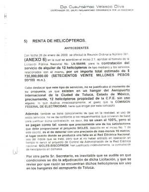 Con fecha 26 de enero de 2000, se efectuó la Reunión Ordinaria Número 361, (ANEXO 6) en la cual se acord{o en el inciso 2.1 aprobar el formato de la Licitación Pública Nacional No. LN-504/99, para la contratación deI servicio de alquiler de 12 helicópteros de tipo rnediano y los servicios relacionados con el mismo, por un importe total estimado de $ 720,000,000.00 (SETECIENTOS VEINTE MILLONES PESOS 00/100 m.n.).