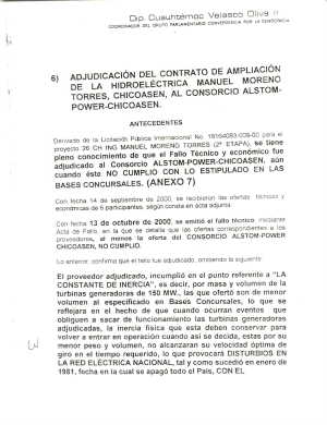Derivado de la Licitación Pública Internacional No. 18164083-009-00 para el proyecto 26 CH ING MANUEL MORENO TORRES (2a. ETAPA), se tiene pleno conocimiento de que el Fallo Técnico y económico fue adjudicado al Consorcio ALSTHOM-POWER-CHCOASEN , aún cuando este NO CUMPLIO CON LO ESTIPULADO EN LAS BASES CONCURSALES. (ANEXO 7)