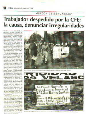 El oficio número 150-499/2001, con fecha de junio 6 del año en curso y dirigido al señor Francisco Javier Villaflor Bojorquez, trabajador de la Comisión Federal de Electricidad, en Guaymas Sonora, firmado por el Jefe del Departamento Jurídico, licenciado Manuel Alberto Villa Marínez, señala en el primer párrafo, lo que a la letra dice: "...Hago de su conocimiento que a partir del día de hoy seis de junio del año dos mil uno queda Usted despedido de su trabajo en la Comisión Federal de Electricidad..."