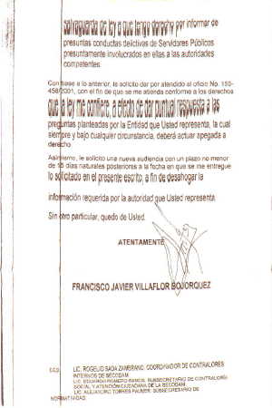 salvaguarda de ley a que tengo derecho por informar presuntas conductas delictivas de Servidores Públicos presuntamente involucrados en ellas a las autoridades competentes.
