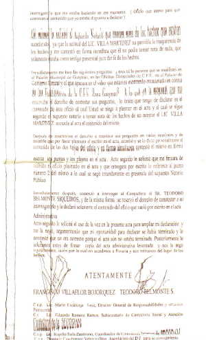 Ahí mismo solicite al supuesto Notario que tomara nota de los hechos que estaban sucediendo, ya que la actitud del LIC. VILLA MARTÍNEZ no permitía la transparencia de los hechos y me contestó en forma inmediata que él no podiá tomar nota de nada, que solo estaba como testigo presencial para dar fe de los hechos.