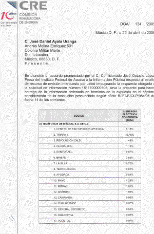 En atención al acuerdo pronunciado por el C. Comisionado José Octavio López Presa del Instituto Federal de Acceso a la Información Pública respecto al escrito de recurso de revisión interpuesto por usted impugnando la respuesta otorgada a la solicitud de información número 1811100000505, sirva la presente para hacer entrega de la información ordenada en términos de lo expuesto en el séptimo considerando de la resolución pronunciada según oficio R/IFAI/JOLP/984/05 de fecha 14 de los corrientes.