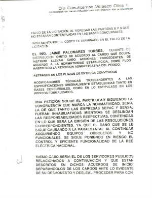 EL ING. JAIME PALOMARES TORRES, GERENTE DE DISTRlBUCIÓN OMITIO DE ACUERDO AL CARGO QUE OCUPA, INSTRUIR LLEVAR CABO ACCIONES PROCEDENTES DE ACUERDO A LA NORMATIVIDAD ESTABLECIDA, COMO PUDO HABER SIDO LA RESCISION ADMINISTRATIVA DEL PEDIDO.