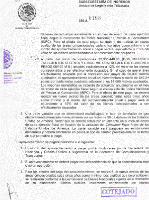 México, D.F. a 08 ABR 2005 Lic. Ángel González Rul A. Me refiero a sus oficios Nos. 115.0230.05 y 115.0734.05 de fechas 21 de enero y 1° de marzo, ambos de 2005, mediante los cuales la Secretaría de Comunicaciones y Transportes solicita la autorización del aprovechamiento definitivo que deberá pagar la empresa Chevron Texaco de México, S.A. de C.V. por la concesión por el uso, aprovechamiento y explotación de bienes del dominio público a que hace referencia el artículo 37 de la Ley de Puertos. Con fundamento en los artículos 31, fracción XI de la Ley Orgánica de la Administración Pública Federal; 50, fracción XXII del Reglamento Interior de la Secretaría de Hacienda y Crédito Público; 10 de la Ley de Ingresos de la Federación para el Ejercicio Fiscal de 2005 y considerando que los montos del aprovechamiento que se solicita se autorice, por una parte, cumplen con los criterios de eficiencia económica y saneamiento financiero que establece el artículo antes citado de la Ley de Ingresos de la Federación para el Ejercicio Fiscal de 2005 y, por la otra, toman como referencia los montos mínimos que esta Unidad Administrativa autorizó mediante el oficio número 350-A-4462 de fecha 11 de octubre de 2004, además de que corresponden a la propuesta económica que presentó la empresa Chevron Texaco de México, S.A. de C.V. con la que resultó ganadora y adjudicataria de la concesión antes referida, esta Secretaría autoriza para el presente ejercicio fiscal a la Secretaría de Comunicaciones y Transportes, bajo el esquema de aprovechamiento, cobrar lo siguiente: 1. Un pago inicial por el otorgamiento de la concesión equivalente al importe de $350,000.00 dólares (TRECIENTOS CINCUENTA MIL DÓLARES DE LOS ESTADOS UNIDOS DE AMÉRICA 00/100) que deberá realizarse en pesos al tipo de cambio prevaleciente en la fecha de pago, que deberá efectuarse en una sola exhibición. 2. Una parte fija del aprovechamiento determinada conforme a lo siguiente: 2.1 Desde el otorgamiento del título de concesión y hasta el inicio de operaciones $1,478,400.00 (UN MILLÓN, CUATROCIENTOS SETENTA Y OCHO MIL CUATROCIENTOS PESOS 00/100 M.N.) anuales equivalentes a 7.5% del valor de los bienes concesionados a ser efectivamente ocupados. En el caso de que el área efectivamente ocupada por la concesión sea mayor de 56,000 metros cuadrados, el aprovechamiento anual se incrementará a razón de $26.40 pesos por cada metro cuadrado adicional a los 56,000 metros cuadrados. Los importes monetarios se