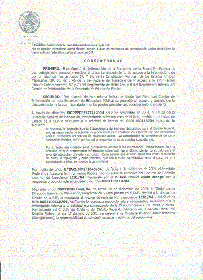 Mediante oficio DGPPPDF/I449/O4, de fecha 14 de diciembre de 2004, el Titular de la Dirección General de Planeación, Programación y Presupuesto en el D.F., remitió a la Unidad de Enlace de la SEP, la respuesta al recurso dé revisión No. expediente 1261/04 y solicitud de folio 0001100118704, ratificando la respuesta proporcionada al recurrente y señalando que la información relativa a la solicitud era competencia de la Dirección General de Obras Públicas. Por acuerdo del C. Jefe de Gobierno del Distrito Federal, publicado en la Gaceta Oficial del Distrito Federal, el día 17 de julio de 2001, se delegó a los Órganos Políticos Administrativos (Delegaciones), la responsabilidad de construir escuelas y edificios delegacionales.