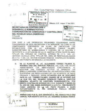 CON BASE A LAS DIFERENTES REUNIONES CELEBRADAS ENTRE FUNCIONARIOS DE ESTA SECRETARÍA Y SU SERVIDOR, ASÍ COMO A LOS COMPROMISOS CONTRAIDOS EN ELLAS, EN PARTICULAR LOS ESTABLECIDOS CON EL LIC. ALEJANDRO TORRES PALMER, SUBSECRETARIO DE NORMATIVIDAD Y CONTROL DE LA GESTIÓN Y REFERENTE A LA ACTUACIÓN DE LA LIC. MARTHA LETICIA PINTO PALMER, TITULAR DEL ÓRGANO DE CONTROL INTERNO EN C.F.E., DEL LIC. ANTONIO CAUDILLO JOYA, TITULAR DEL ÁREA DE RESPONSABILIDADES EN C.F.E. Y DEL LIC. HECTOR ROSADO PENICHE, CONTRALOR REGIONAL CENTRO, ME PERMITO INFORMARLE LO SIGUIENTE: