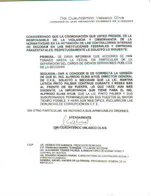 SEGUNDA.- DAR A CONOCER SI ES CORRECTA LA VERSIÓN DE QUE EL ING. ALFREDO ELÍAS AYUB, DIRECTOR GENERAL DE C.F.E., SOLICITÓ A SECODAM QUE LA LIC. MARTHA LETICIA PINTO PALMER CONTINUE DURANTE 2 MESES MÁS AL FRENTE DE SU PUESTO, LO QUE HACE AUN MÁS EVIDENTE, LA IMPORTANCIA QUE TIENE PARA EL ING. ALFREDO ELÍAS AYUB, QUE LA LIC. PINTO PALMER Y SUS SUBORDINADOS PERMANEZCAN EN SUS PUESTOS EL MAYOR TIEMPO POSIBLE, Y HARÁ AUN MÁS DIFÍCIL ESCLARECER LAS DENUNCIAS DE CORRUPCIÓN EN C.F.E.