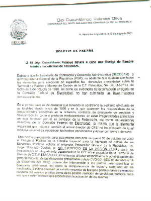Debido a que la Secretariá de Contraloría y Desarrollo Administrativo (SECODAM) y la Procuraduría General de la República (PGR), no obstante que cuentan con todos los elementos para sancionar en específico las denuncias presentadas sobre la Terminal de Recibo y Manejo de Carbón de la C.T. Petacalco, No. Lic. LI-507/93 de fecha 9 de octubre de 1998, así como las evidencias de la corrupción arraigada en la Comisión Federal de Electricidad, no han culminado las investigaciones correspondientes.
