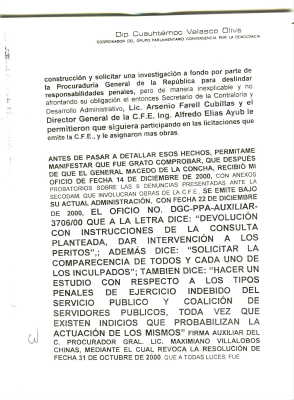 construcción y solicitar una investigación a fondo por parte de la Procuraduria General de la República para deslindar responsabilidades penales, pero de manera inexplicable y no afrontando su obligación el entonces Secretario de la Contraloria Y Desarroilo Administrativo, Lic. Arsenio Farell Cubillas y el Director General de la C.F.E. Ing. Alfredo Elias Ayub le permitieron que siguiera participando en las licitaciones que emite la C.F.E., y le asignaron mas obras.