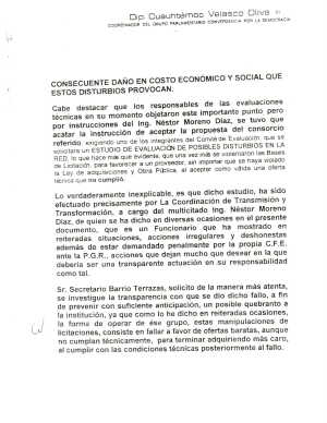 Lo verdaderamente inexpticable, es que dicho estudio, ha sido efectuado precisamente por La Coordinación de Transmisión y Transformación, a cargo del multicitado Ing, Nestor Moreno Diaz, de quien se ha dicho en diversas ocasiones en el presente documento, que es un Funcionario que ha mostrado en reiteradas situaciones, acciones irregulares y deshonestas además de estar demandado penalmente por la propia C.F.E. ante ia P.G.R., acciones que dejan mucho que desear en la que deberia ser una transparente actuación en su responsabilidad como tal.
