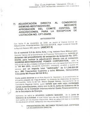 En el numeral 3.5 de dlcha Acta, eI Ing. Antonio Pérez Milicua Lavin, Gerente Técnico de la Coordinación de Proyectos Termoeléctricos, solicitó el dlctarnen del procedimiento de excepción de licitación No. CPT-004/00, para realizar la adjudIcacion directa con el consorcio SIEMENS-WESTINGHOUSE POWER CORPORATION, para la adquisición de dos unidades turbogeneradores con una capacidad neta mínima de 150 MW (ISO), incluyendo suministro, instaiación, pruebas y puesta en servicio, por un importe total "estimado" de $1,348,850.00 m.n.. (Mil Trescientos Cuarenta y ocho Millones, Ochocientos Cincuenta Mil pesos 00/100 M.N.).