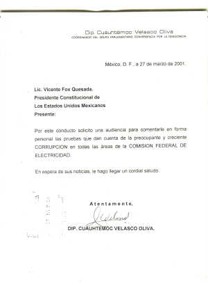 Por este conducto solicito una audiencia para comentarle en forma personal las pruebas que dan cuenta de la preocupante y creciente CORRUPCIÓN en todas las áreas de la COMISIÓN FEDERAL DE ELECTRICIDAD.