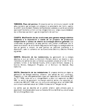 La central que se describe en el párrafo anterior, será utilizada para la exportación de energía eléctrica a los Estados Unidos de América, a la empresa Sempra Energy Resources.