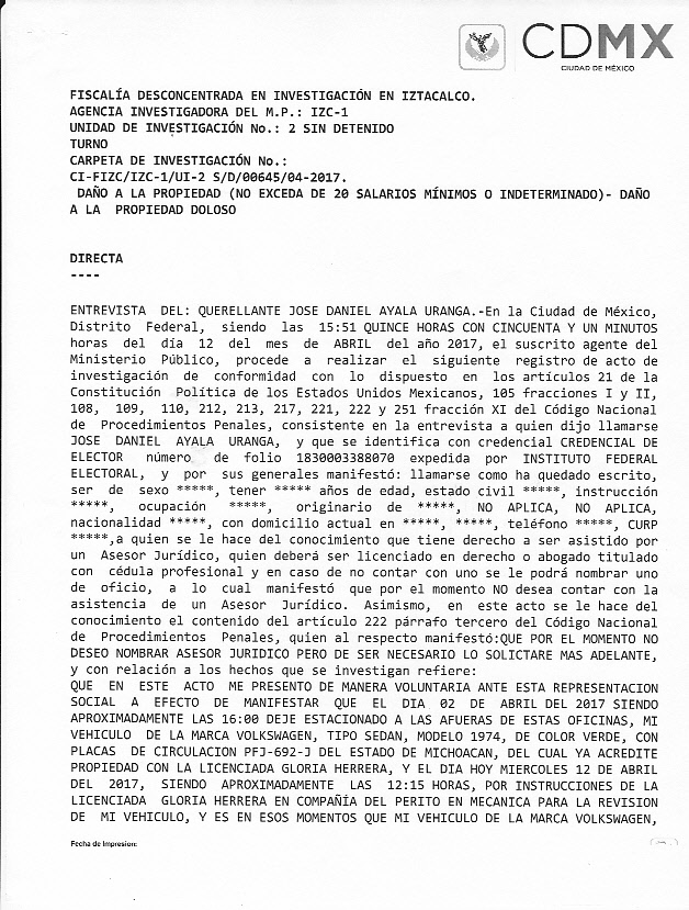 3. ESTA ES LA PRINCIPAL FALTA AL RIGOR DEL QUE PRESUMEN LOS ABOGADOS. EL MISMO 12 DE ABRIL DE 2017 SE PRESENTARON LOS PERITOS EN MI DOMICILIO Y REALIZARON EL PERITAJE SOBRE LOS DAÑOS A MI VEHÍCULO. SIN EMBARGO, ESTE NO ESTA INCLUIDO EN LA CARPETA DE INVESTIGACIÓN.