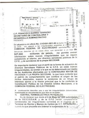 En alcance a mi oficio No, CV0/001-SEC-00 de fecha 14 de diciembre de 2000. con relación a las irregularidades existentes al interior de la COMISION FEDERAL DE ELECTRICIDAD asentadas en las 9 Denuncias descritas en mi citado Oficio, que ascienden a un total de $27,000 millones de pesos, me permito anexar información sobre nuevas irregularidades que se siguen cometiendo al interior, por diversos servidores púiblicos de la C.F.E., y de servidores de la propia SECODAM.