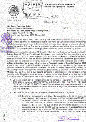 México, D.F. a 08 ABR 2005 Lic. Ángel González Rul A. Me refiero a sus oficios Nos. 115.0230.05 y 115.0734.05 de fechas 21 de enero y 1° de marzo, ambos de 2005, mediante los cuales la Secretaría de Comunicaciones y Transportes solicita la autorización del aprovechamiento definitivo que deberá pagar la empresa Chevron Texaco de México, S.A. de C.V. por la concesión por el uso, aprovechamiento y explotación de bienes del dominio público a que hace referencia el artículo 37 de la Ley de Puertos. Con fundamento en los artículos 31, fracción XI de la Ley Orgánica de la Administración Pública Federal; 50, fracción XXII del Reglamento Interior de la Secretaría de Hacienda y Crédito Público; 10 de la Ley de Ingresos de la Federación para el Ejercicio Fiscal de 2005 y considerando que los montos del aprovechamiento que se solicita se autorice, por una parte, cumplen con los criterios de eficiencia económica y saneamiento financiero que establece el artículo antes citado de la Ley de Ingresos de la Federación para el Ejercicio Fiscal de 2005 y, por la otra, toman como referencia los montos mínimos que esta Unidad Administrativa autorizó mediante el oficio número 350-A-4462 de fecha 11 de octubre de 2004, además de que corresponden a la propuesta económica que presentó la empresa Chevron Texaco de México, S.A. de C.V. con la que resultó ganadora y adjudicataria de la concesión antes referida, esta Secretaría autoriza para el presente ejercicio fiscal a la Secretaría de Comunicaciones y Transportes, bajo el esquema de aprovechamiento, cobrar lo siguiente: 1. Un pago inicial por el otorgamiento de la concesión equivalente al importe de $350,000.00 dólares (TRECIENTOS CINCUENTA MIL DÓLARES DE LOS ESTADOS UNIDOS DE AMÉRICA 00/100) que deberá realizarse en pesos al tipo de cambio prevaleciente en la fecha de pago, que deberá efectuarse en una sola exhibición. 2. Una parte fija del aprovechamiento determinada conforme a lo siguiente: 2.1 Desde el otorgamiento del título de concesión y hasta el inicio de operaciones $1,478,400.00 (UN MILLÓN, CUATROCIENTOS SETENTA Y OCHO MIL CUATROCIENTOS PESOS 00/100 M.N.) anuales equivalentes a 7.5% del valor de los bienes concesionados a ser efectivamente ocupados. En el caso de que el área efectivamente ocupada por la concesión sea mayor de 56,000 metros cuadrados, el aprovechamiento anual se incrementará a razón de $26.40 pesos por cada metro cuadrado adicional a los 56,000 metros cuadrados. Los importes monetarios se