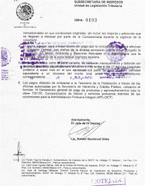 4. El monto a pagar será independiente del pago que la concesionaria deberá efectuar al Gobierno Federal, con motivo de la diversa concesión que le haya otorgado la Secretaría del Medio Ambiente y Recursos Naturales o la dependencia que la sustituya respecto de la zona federal marítimo terrestre. 5. Tanto la parte fija como la variable, se causarán mensualmente y deberán ser cubiertas mediante pagos que se efectuarán a más tardar el día 17 del mes inmediato posterior a aquel mes en el que se causa. La parte fija será por una cantidad equivalente a un doceavo del monto total anual de la contraprestación correspondiente. 6. Los pagos deberán enterarse a la Tesorería de la Federación a través de las oficinas autorizadas por la Secretaría de Hacienda y Crédito Público, utilizando el formato 16 Declaración general de pago de productos y aprovechamiento bajo la clave 700125, Concesionarios de bienes y servicios portuarios distintos de las concesiones para la Administración Portuaria Integral (API) (SCT). Atentamente JSM/IGM