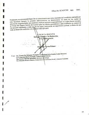 Finalmente, es conveniente hacer de su conocimiento que como resultado de la auditoría realizada por esta Secretaría durante la presente administración, se determinaron 10 casos en los cuales se advirtieron irregularidades que pudieran implicar presunta responsabilidad, los cuales fueron tumados al Titular del Órgano Interno de Control para los efectos procedentes y para establecer un control de las acciones inherentes a cada uno de los casos, instruyendo un seguimiento punrual, a efecto de que todo se desarrolle conforme a la normatividad aplicable.