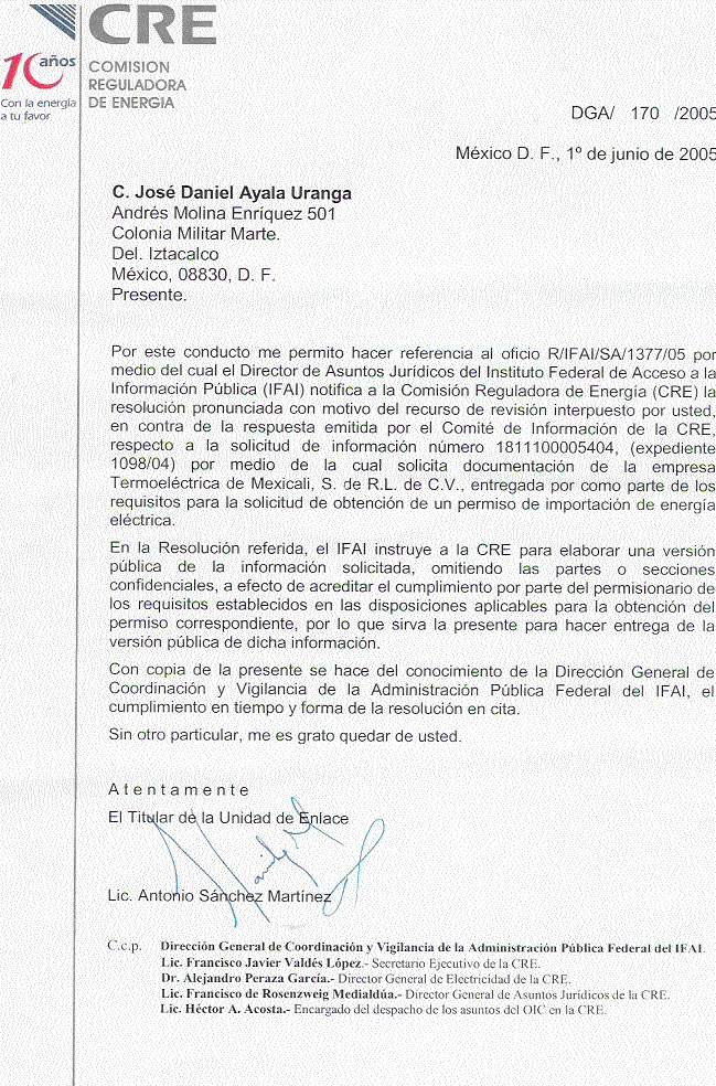 En alcance a la solicitud recibida con No. de Folio 1811100005404, dirigida a la Unidad de enlace de COMISIÓN REGULADORA DE ENERGÍA, el día 07/10/2004, nos permitimos hacer de su conocimiento que Con fundamento en los artículos 44 y 45 de la Ley Federal de Transparencia y Acceso a la Información Pública Gubernamental, la información no puede ser proporcionada debido a que es: |