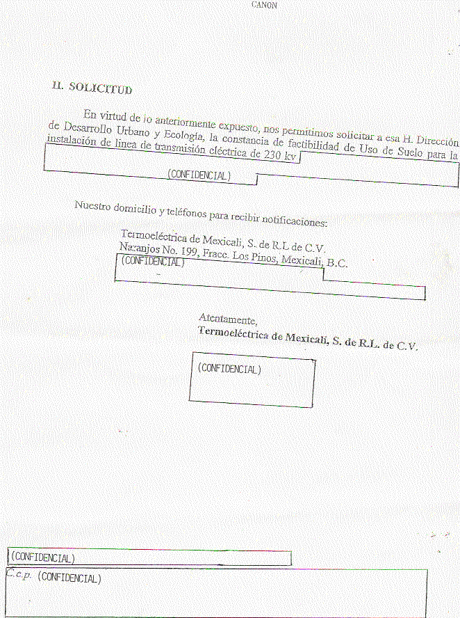 "Agradeceré me sea proporcionado el escrito presentado con fecha 22 de marzo de 2001, ante la Dirección de Desarrollo Urbano y Ecología del Ayuntamiento de Mexicali, Baja California, en la cual se solicita la constancia de factibilidad de uso de suelo para la instalación de la línea de transmisión de 230 kV a que la RES/077/2001 se refiere."